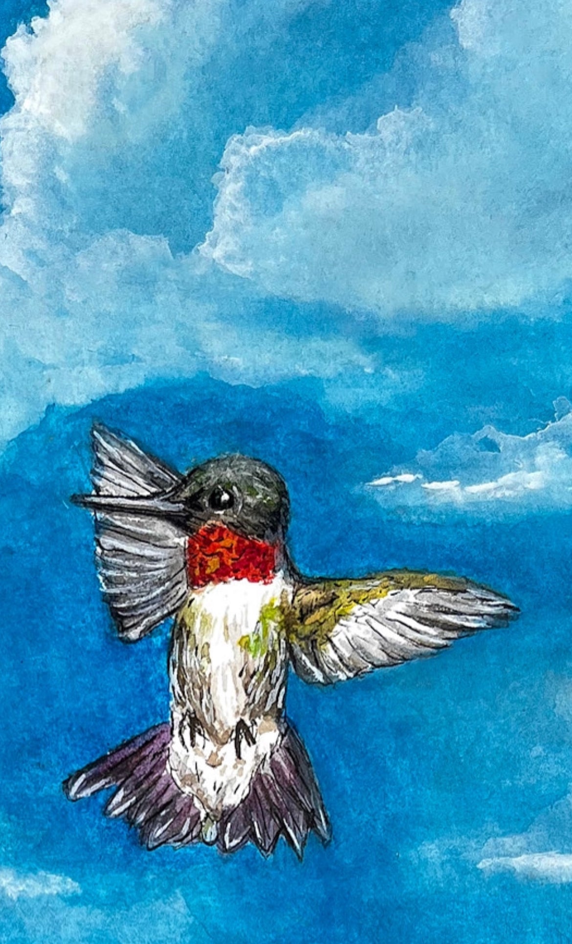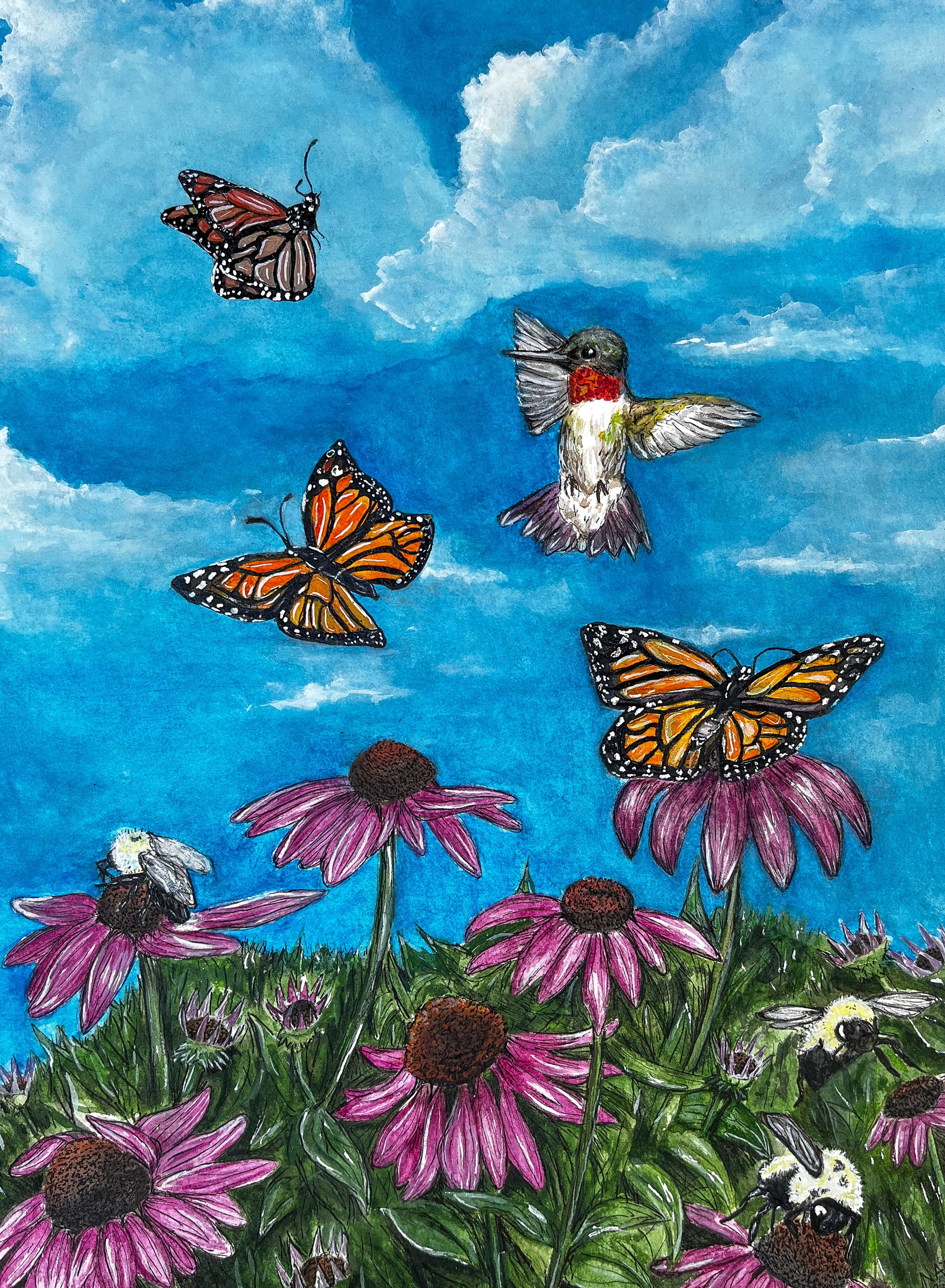 8x10 Print of original gouache painting, featuring magical monarch butterflies, echinacea flowers, bumblebees, and a ruby throated hummingbird!
